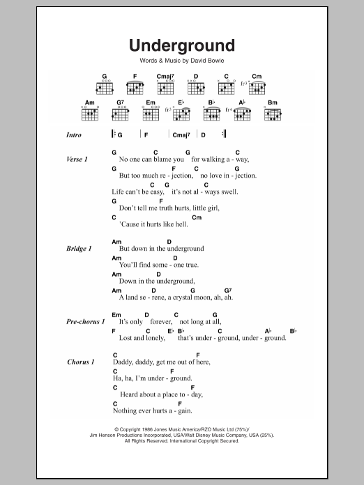 Download or print David Bowie Underground sheet music, chords and digital score arranged for Guitar Chords/Lyrics. This Rock score includes 3 page(s).