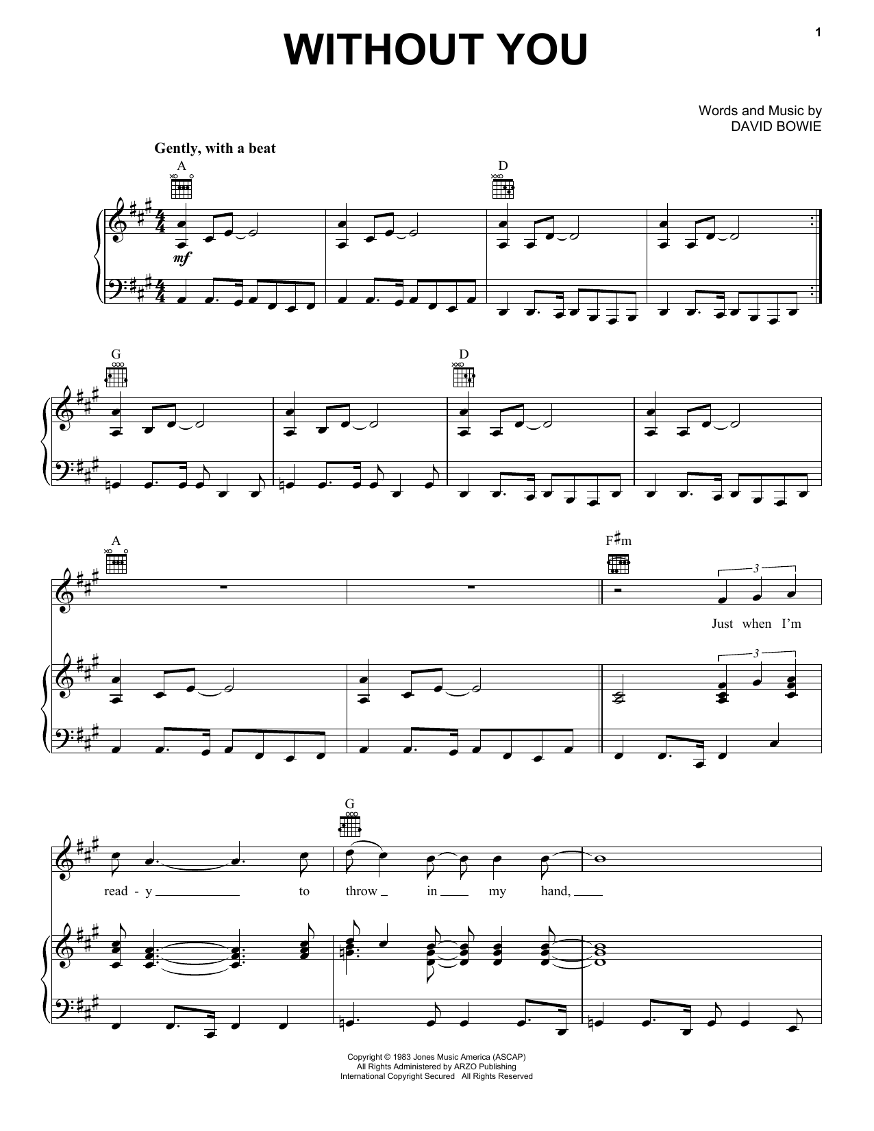 Download or print David Bowie Without You sheet music, chords and digital score arranged for Piano, Vocal & Guitar Chords (Right-Hand Melody). This Rock score includes 4 page(s).