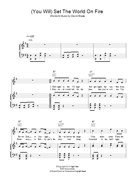 Download or print David Bowie (You Will) Set The World On Fire sheet music, chords and digital score arranged for Piano, Vocal & Guitar Chords. This Alternative score includes 5 page(s).