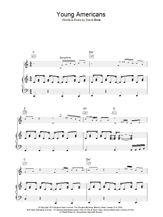 Download or print David Bowie Young Americans sheet music, chords and digital score arranged for Piano, Vocal & Guitar Chords (Right-Hand Melody). This Pop score includes 9 page(s).