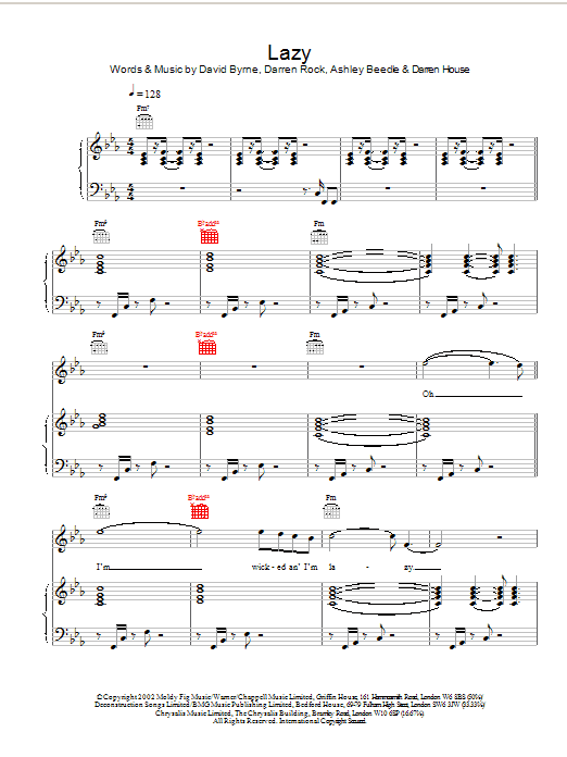 Download or print David Byrne Lazy sheet music, chords and digital score arranged for Guitar Chords/Lyrics. This Pop score includes 3 page(s).