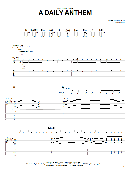 Download or print David Cook A Daily Anthem sheet music, chords and digital score arranged for Guitar Tab. This Pop score includes 10 page(s).