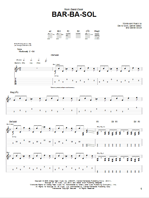 Download or print David Cook Bar-Ba-Sol sheet music, chords and digital score arranged for Guitar Tab. This Pop score includes 11 page(s).