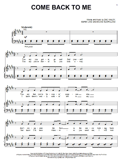 Download or print David Cook Come Back To Me sheet music, chords and digital score arranged for Piano, Vocal & Guitar Chords (Right-Hand Melody). This Pop score includes 8 page(s).