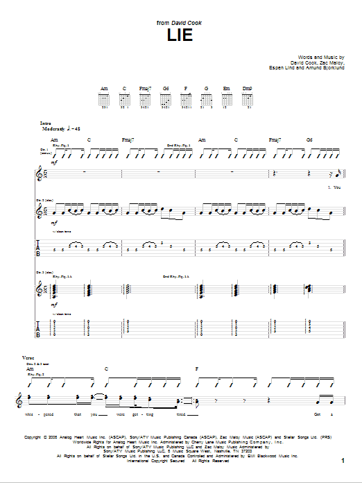 Download or print David Cook Lie sheet music, chords and digital score arranged for Guitar Tab. This Pop score includes 9 page(s).