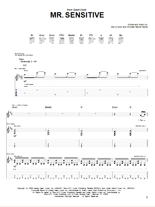 Download or print David Cook Mr. Sensitive sheet music, chords and digital score arranged for Guitar Tab. This Pop score includes 7 page(s).