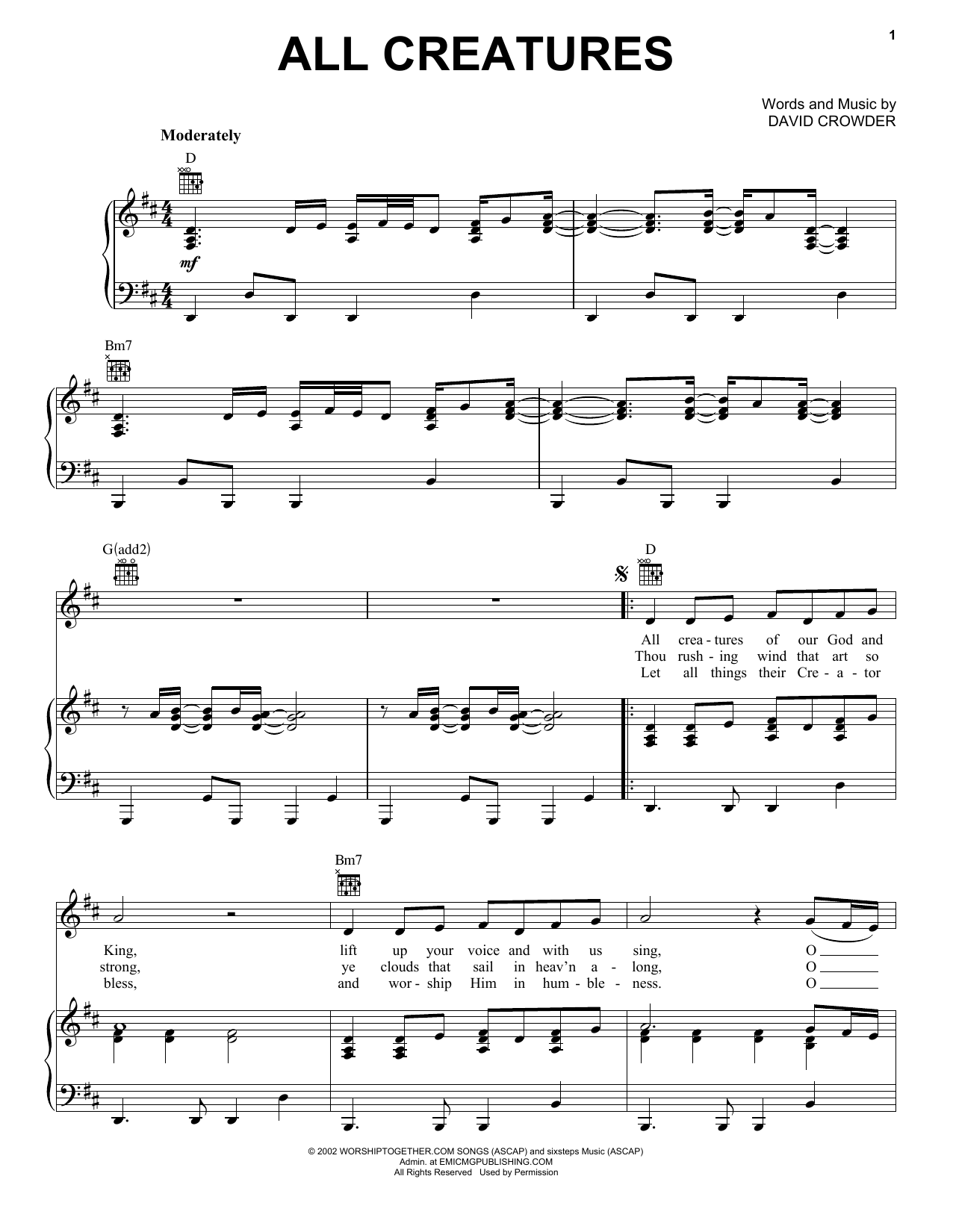 Download or print David Crowder*Band All Creatures Of Our God And King sheet music, chords and digital score arranged for Piano, Vocal & Guitar Chords (Right-Hand Melody). This Christian score includes 5 page(s).
