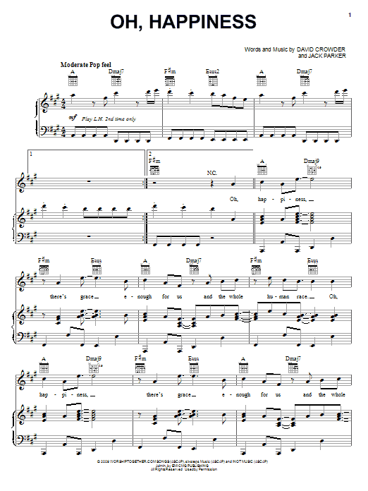 Download or print David Crowder Band Oh, Happiness sheet music, chords and digital score arranged for Piano, Vocal & Guitar Chords (Right-Hand Melody). This Christian score includes 5 page(s).