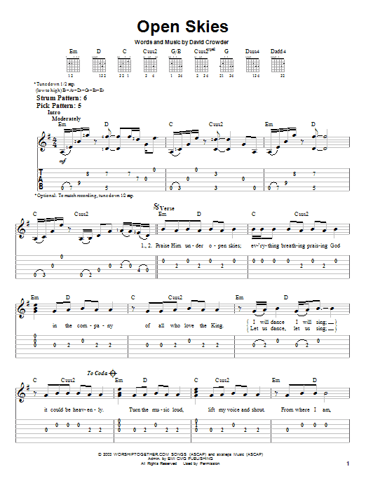 Download or print David Crowder Band Open Skies sheet music, chords and digital score arranged for Easy Guitar Tab. This Christian score includes 4 page(s).