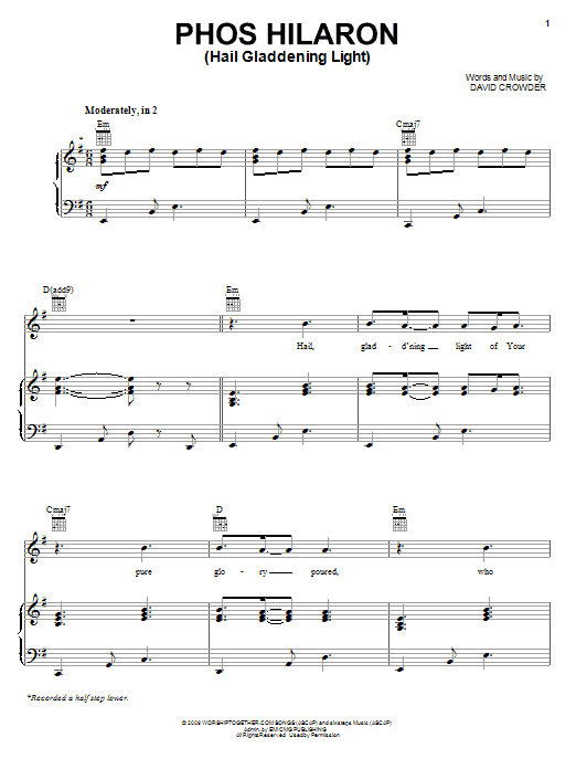 Download or print David Crowder Band Phos Hilaron (Hail Gladdening Light) sheet music, chords and digital score arranged for Piano, Vocal & Guitar Chords (Right-Hand Melody). This Christian score includes 5 page(s).