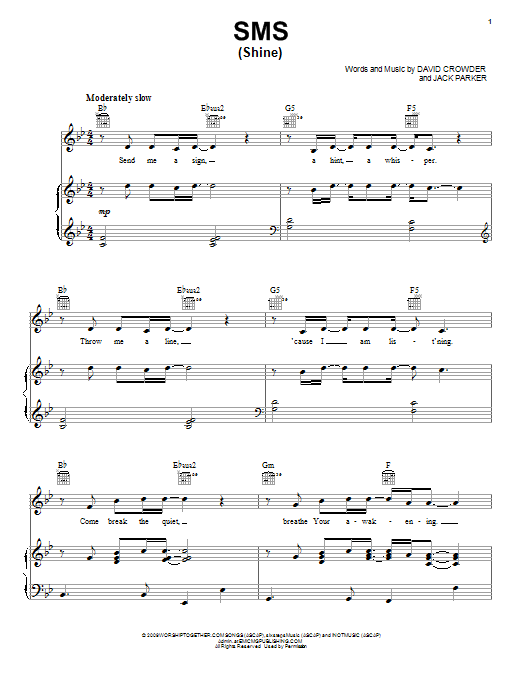 Download or print David Crowder Band SMS (Shine) sheet music, chords and digital score arranged for Piano, Vocal & Guitar Chords (Right-Hand Melody). This Christian score includes 5 page(s).