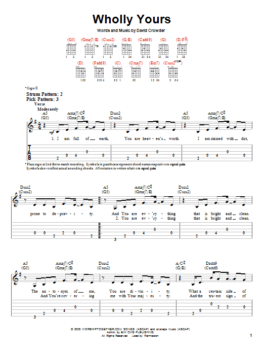 Download or print David Crowder Band Wholly Yours sheet music, chords and digital score arranged for Easy Guitar Tab. This Christian score includes 4 page(s).