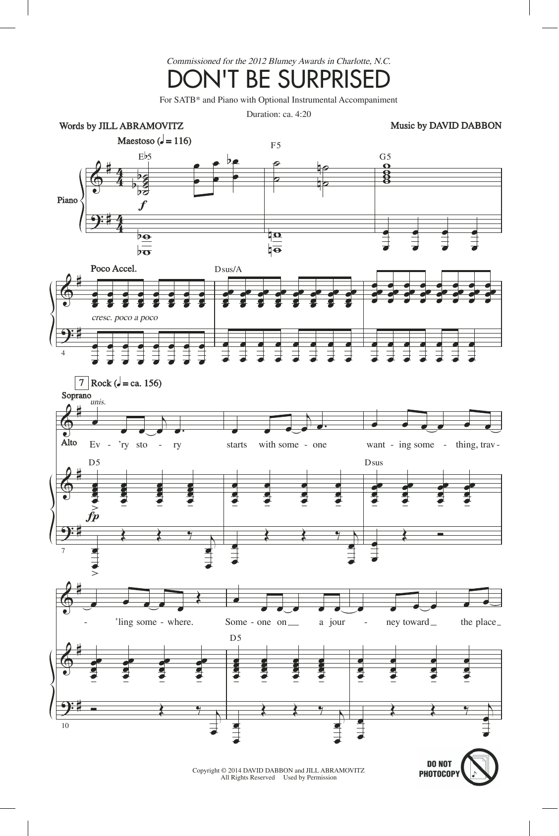 Download or print Jill Abramovitz Don't Be Surprised sheet music, chords and digital score arranged for SATB Choir. This Pop score includes 17 page(s).