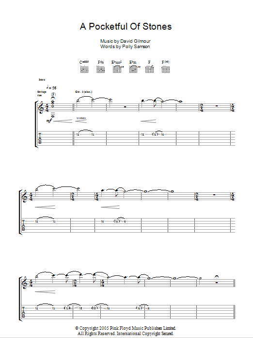 Download or print David Gilmour A Pocketful Of Stones sheet music, chords and digital score arranged for Guitar Tab. This Pop score includes 5 page(s).