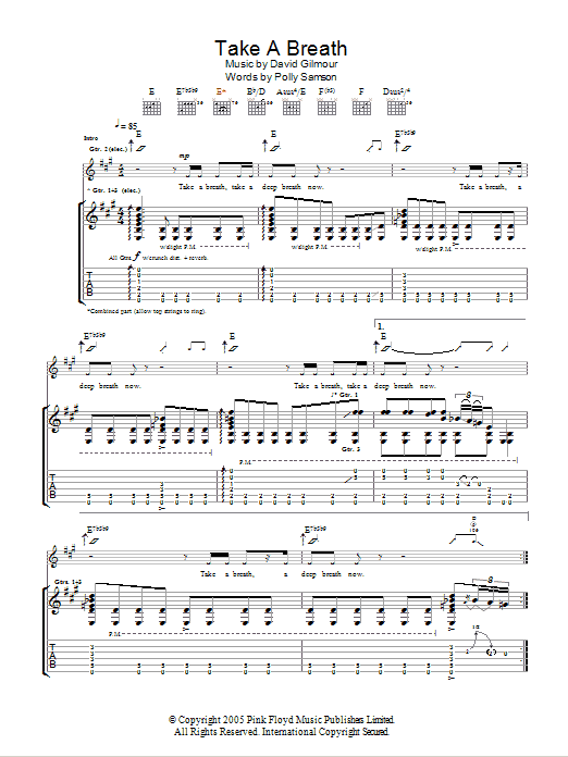 Download or print David Gilmour Take A Breath sheet music, chords and digital score arranged for Guitar Tab. This Pop score includes 7 page(s).