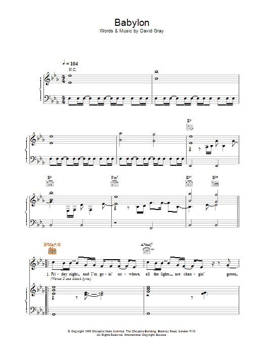 Download or print David Gray Babylon sheet music, chords and digital score arranged for Piano, Vocal & Guitar Chords (Right-Hand Melody). This Folk score includes 8 page(s).