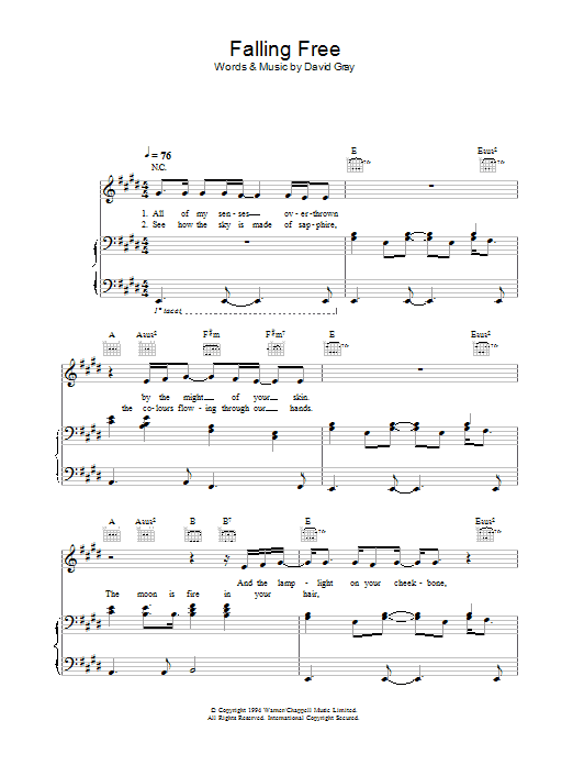 Download or print David Gray Falling Free sheet music, chords and digital score arranged for Piano, Vocal & Guitar Chords. This Pop score includes 6 page(s).