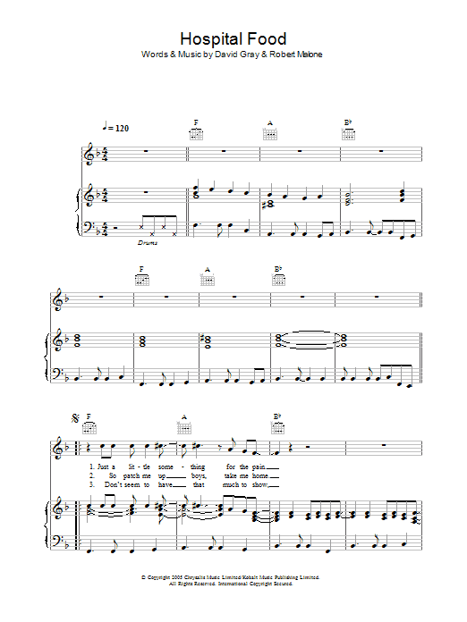 Download or print David Gray Hospital Food sheet music, chords and digital score arranged for Piano, Vocal & Guitar Chords. This Pop score includes 7 page(s).