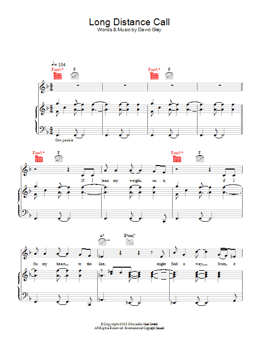 Download or print David Gray Long Distance Call sheet music, chords and digital score arranged for Guitar Tab. This Pop score includes 5 page(s).
