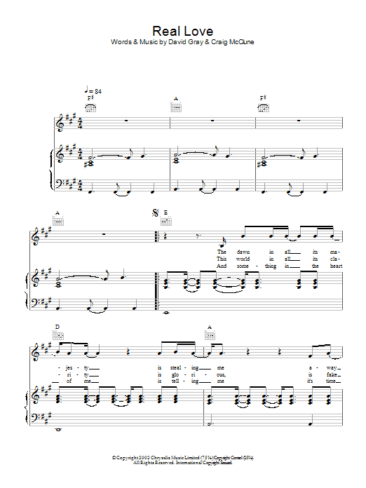 Download or print David Gray Real Love sheet music, chords and digital score arranged for Guitar Tab. This Pop score includes 7 page(s).