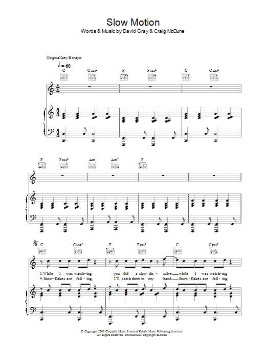 Download or print David Gray Slow Motion sheet music, chords and digital score arranged for Piano, Vocal & Guitar Chords. This Pop score includes 5 page(s).