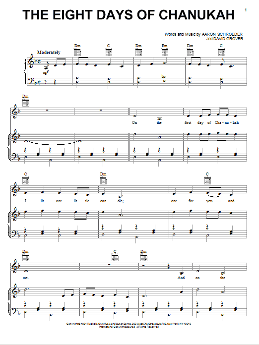 Download or print David Grover & The Big Bear Band The Eight Days Of Chanukah sheet music, chords and digital score arranged for Piano, Vocal & Guitar Chords (Right-Hand Melody). This Hanukkah score includes 11 page(s).