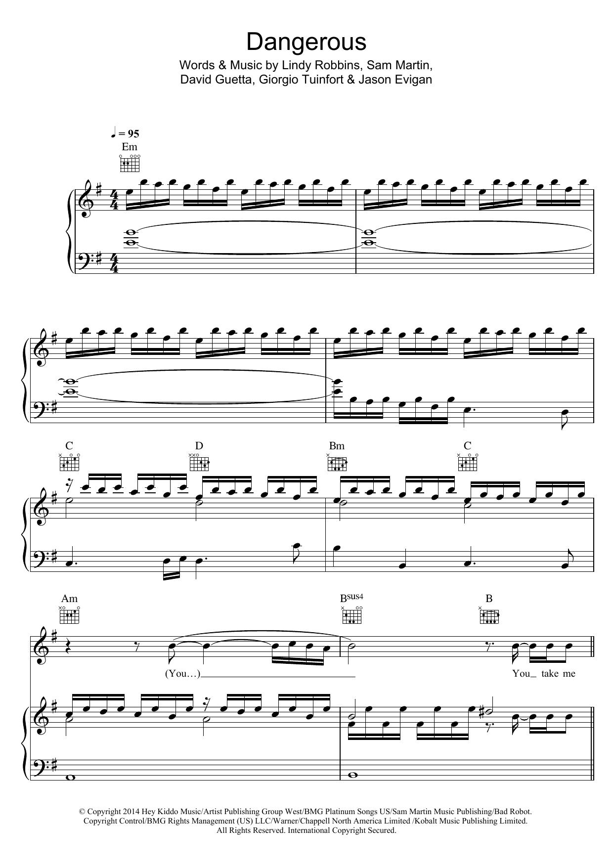 Download or print David Guetta Dangerous (feat. Sam Martin) sheet music, chords and digital score arranged for Piano, Vocal & Guitar Chords. This Pop score includes 8 page(s).