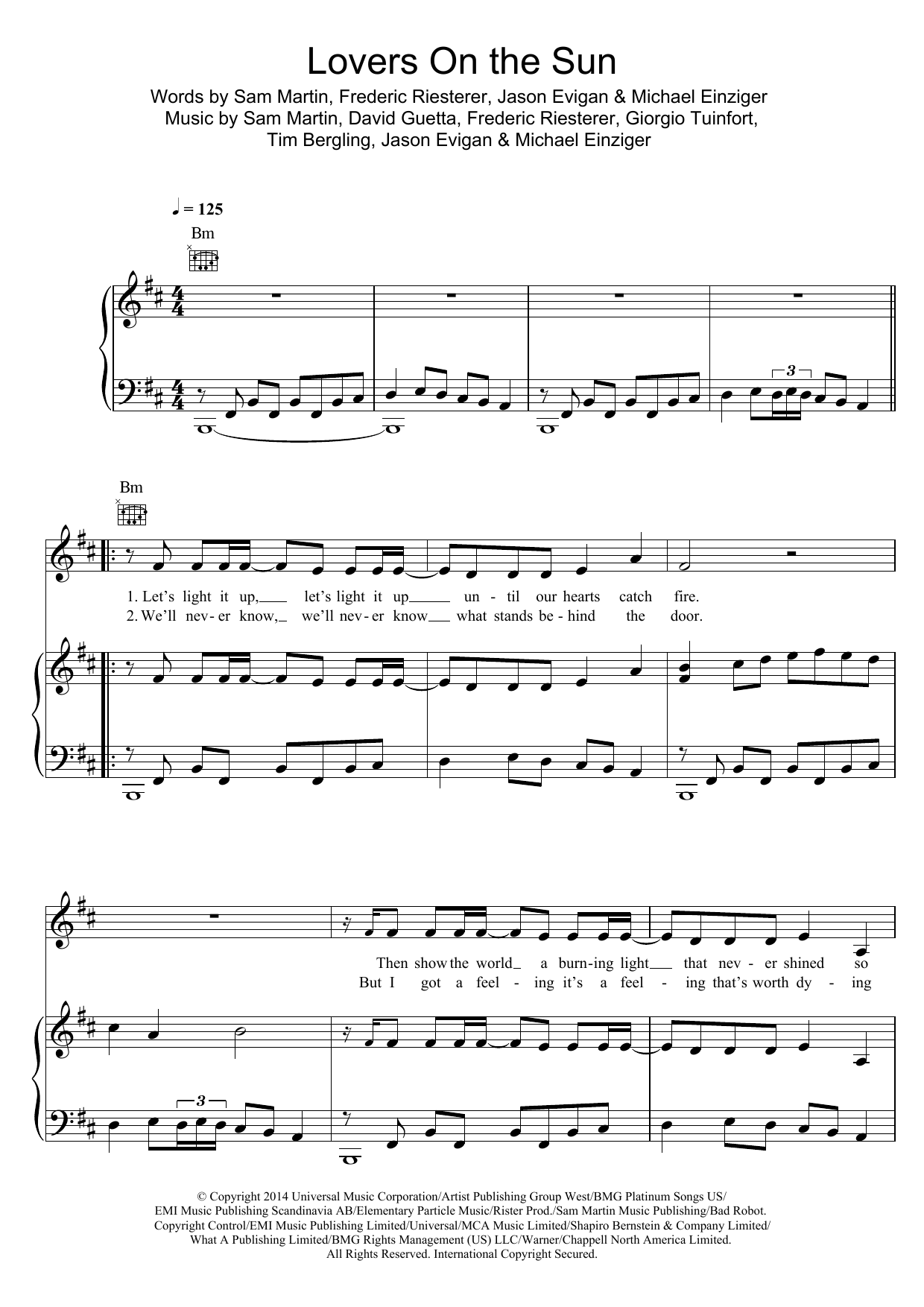 Download or print David Guetta Lovers On The Sun (featuring Sam Martin) sheet music, chords and digital score arranged for Piano, Vocal & Guitar Chords. This Pop score includes 5 page(s).