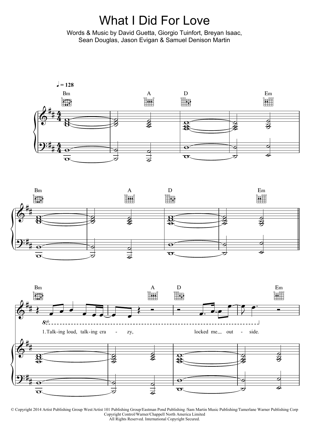 Download or print David Guetta What I Did For Love (feat. Emeli Sande) sheet music, chords and digital score arranged for Piano, Vocal & Guitar Chords. This Pop score includes 9 page(s).