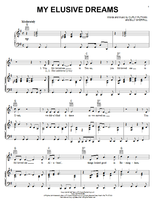 Download or print David Houston & Tammy Wynette My Elusive Dreams sheet music, chords and digital score arranged for Piano, Vocal & Guitar Chords (Right-Hand Melody). This Country score includes 2 page(s).
