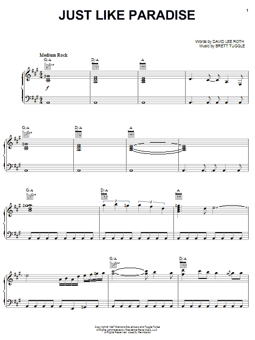 Download or print David Lee Roth Just Like Paradise sheet music, chords and digital score arranged for Guitar Tab (Single Guitar). This Metal score includes 12 page(s).