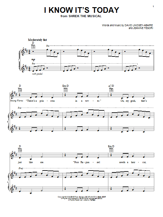 Download or print David Lindsay-Abaire I Know It's Today sheet music, chords and digital score arranged for Lead Sheet / Fake Book. This Children score includes 4 page(s).