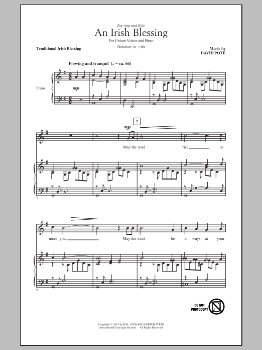 Download or print David Pote An Irish Blessing sheet music, chords and digital score arranged for Unison Choir. This Irish score includes 3 page(s).