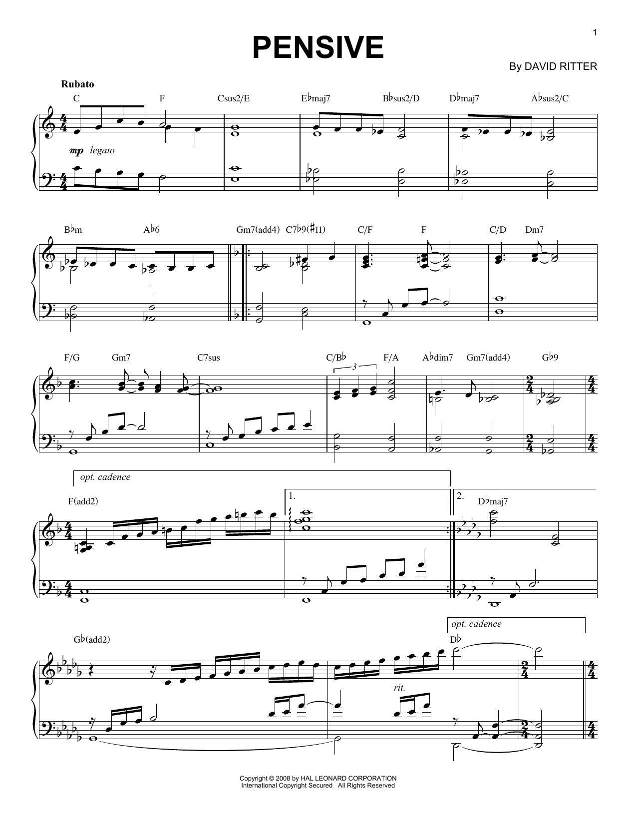 Download or print David Ritter Pensive sheet music, chords and digital score arranged for Piano Solo. This Sacred score includes 2 page(s).