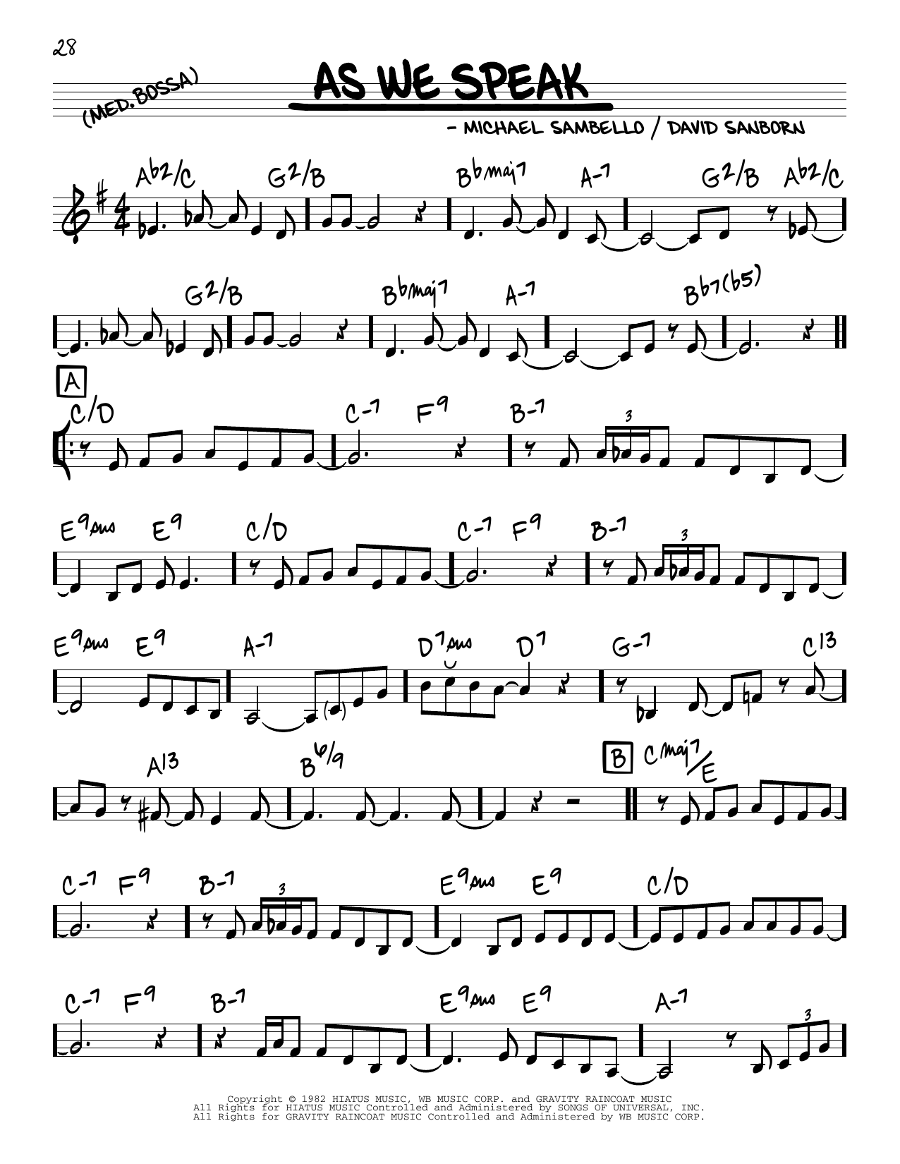 Download or print David Sanborn As We Speak sheet music, chords and digital score arranged for Soprano Sax Transcription. This Jazz score includes 6 page(s).