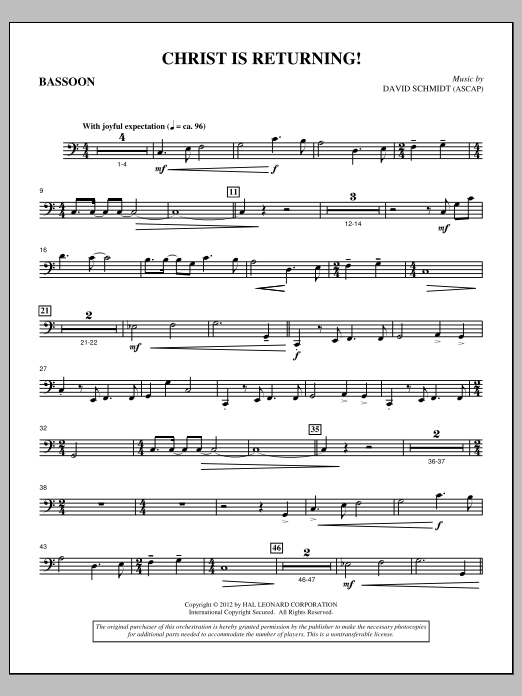Download or print David Schmidt Christ Is Returning! - Bassoon sheet music, chords and digital score arranged for Choir Instrumental Pak. This Concert score includes 2 page(s).