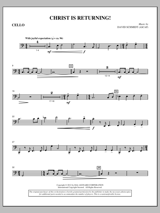 Download or print David Schmidt Christ Is Returning! - Cello sheet music, chords and digital score arranged for Choir Instrumental Pak. This Concert score includes 3 page(s).