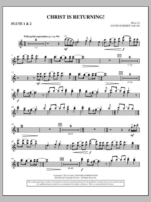 Download or print David Schmidt Christ Is Returning! - Flute 1 & 2 sheet music, chords and digital score arranged for Choir Instrumental Pak. This Concert score includes 2 page(s).