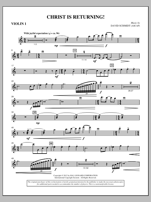 Download or print David Schmidt Christ Is Returning! - Violin 1 sheet music, chords and digital score arranged for Choir Instrumental Pak. This Concert score includes 2 page(s).