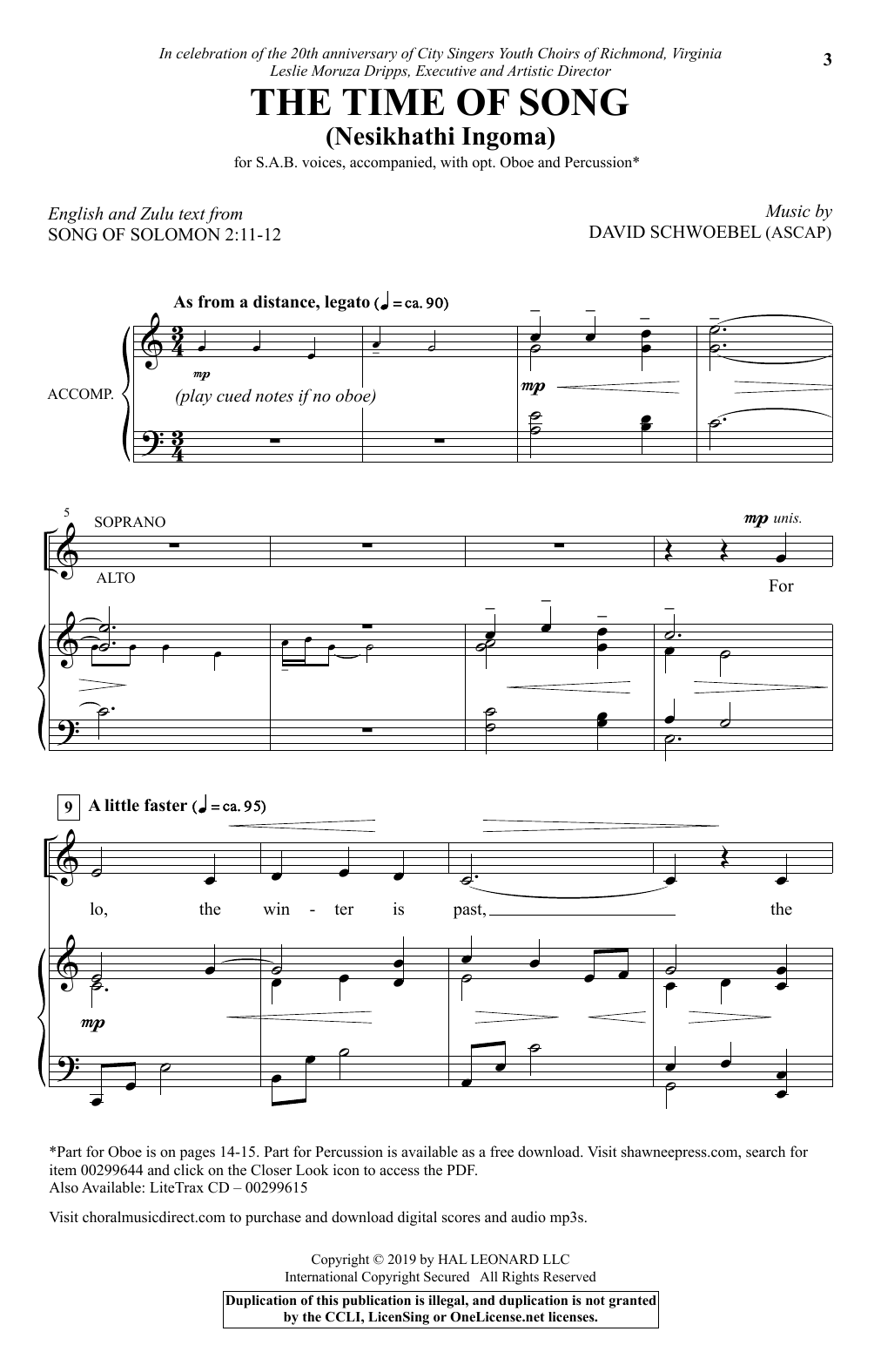 Download or print David Schwoebel The Time Of Song (Nesikhathi Ingoma) sheet music, chords and digital score arranged for SAB Choir. This Sacred score includes 14 page(s).