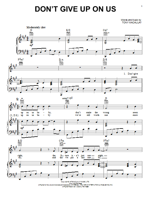 Download or print David Soul Don't Give Up On Us sheet music, chords and digital score arranged for Lead Sheet / Fake Book. This Pop score includes 1 page(s).