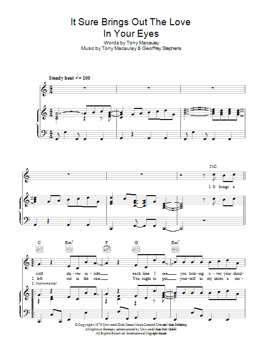 Download or print David Soul It Sure Brings Out The Love In Your Eyes sheet music, chords and digital score arranged for Piano, Vocal & Guitar Chords. This Standards score includes 4 page(s).