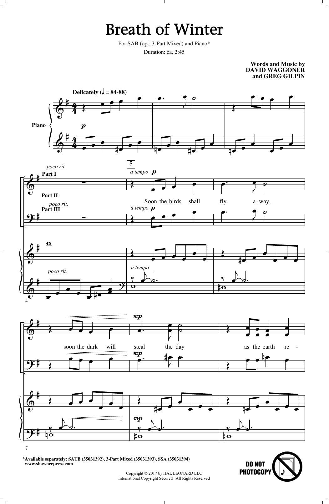 Download or print David Waggoner and Greg Gilpin Breath Of Winter sheet music, chords and digital score arranged for 3-Part Mixed Choir. This Concert score includes 6 page(s).