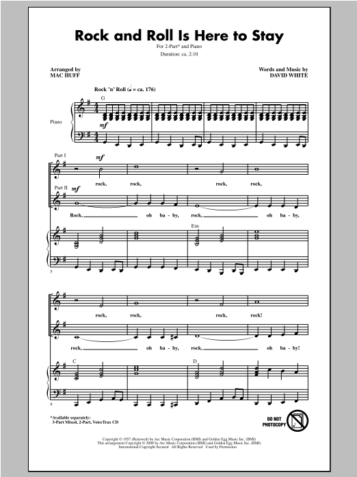 Download or print Mac Huff Rock And Roll Is Here To Stay sheet music, chords and digital score arranged for 2-Part Choir. This Rock score includes 10 page(s).