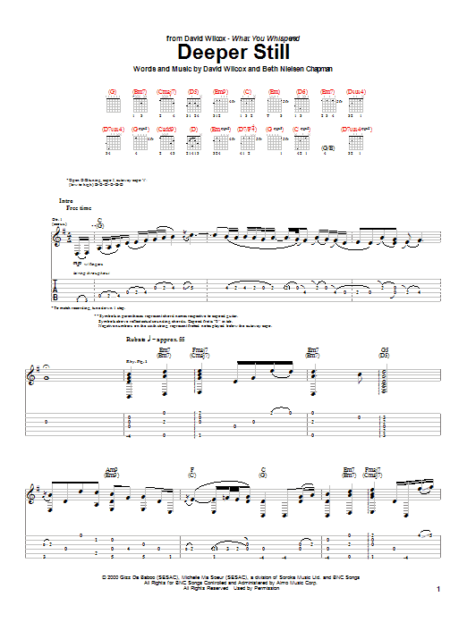 Download or print David Wilcox Deeper Still sheet music, chords and digital score arranged for Guitar Tab. This Folk score includes 4 page(s).