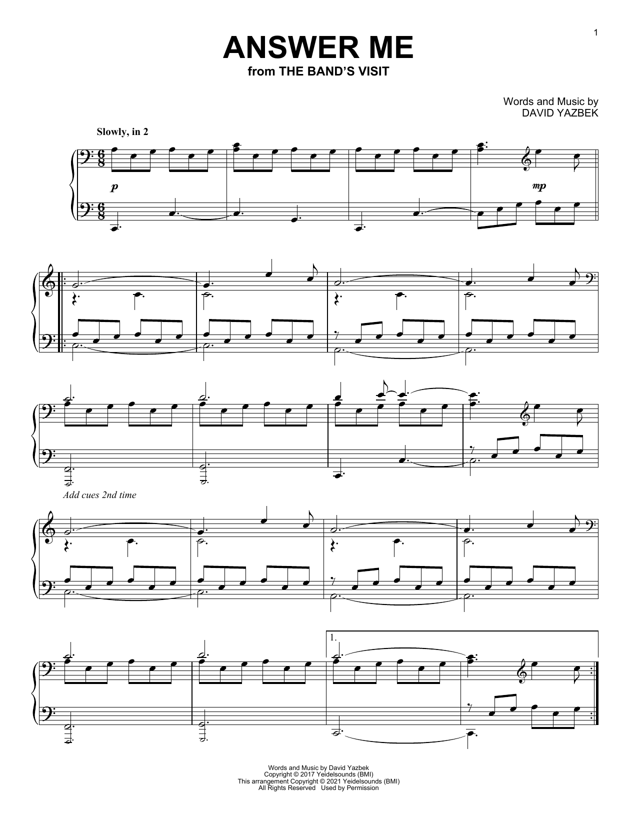 Download or print David Yazbek Answer Me (from The Band's Visit) sheet music, chords and digital score arranged for Piano Solo. This Broadway score includes 3 page(s).