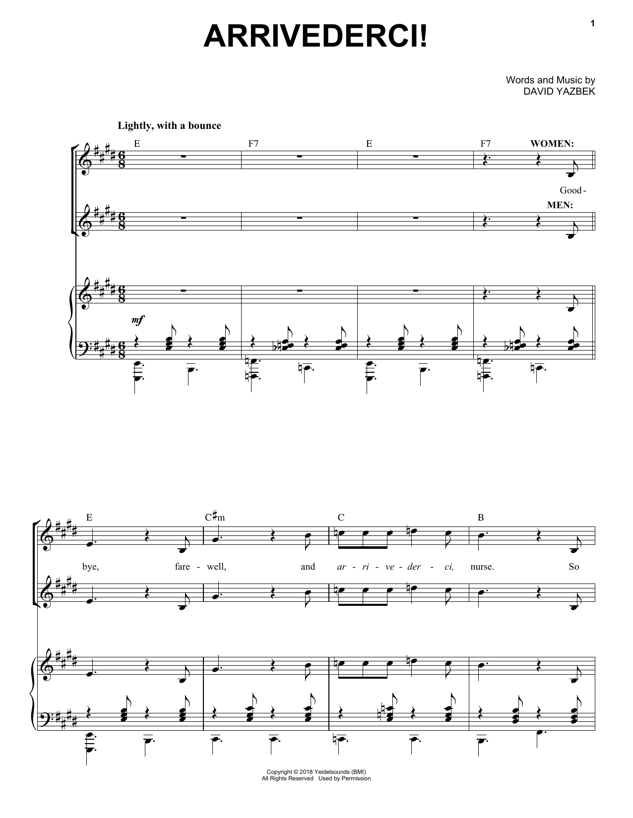 Download or print David Yazbek Arrivederci! (from the musical Tootsie) sheet music, chords and digital score arranged for Piano & Vocal. This Musical/Show score includes 5 page(s).