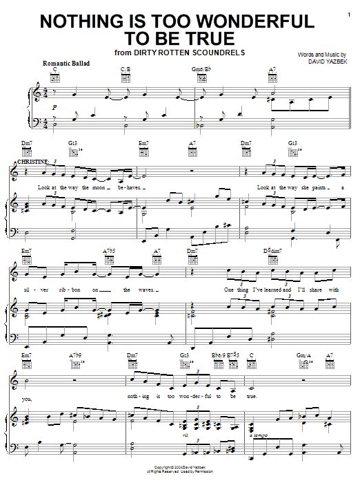 Download or print David Yazbek Nothing Is Too Wonderful To Be True sheet music, chords and digital score arranged for Lead Sheet / Fake Book. This Musical/Show score includes 2 page(s).