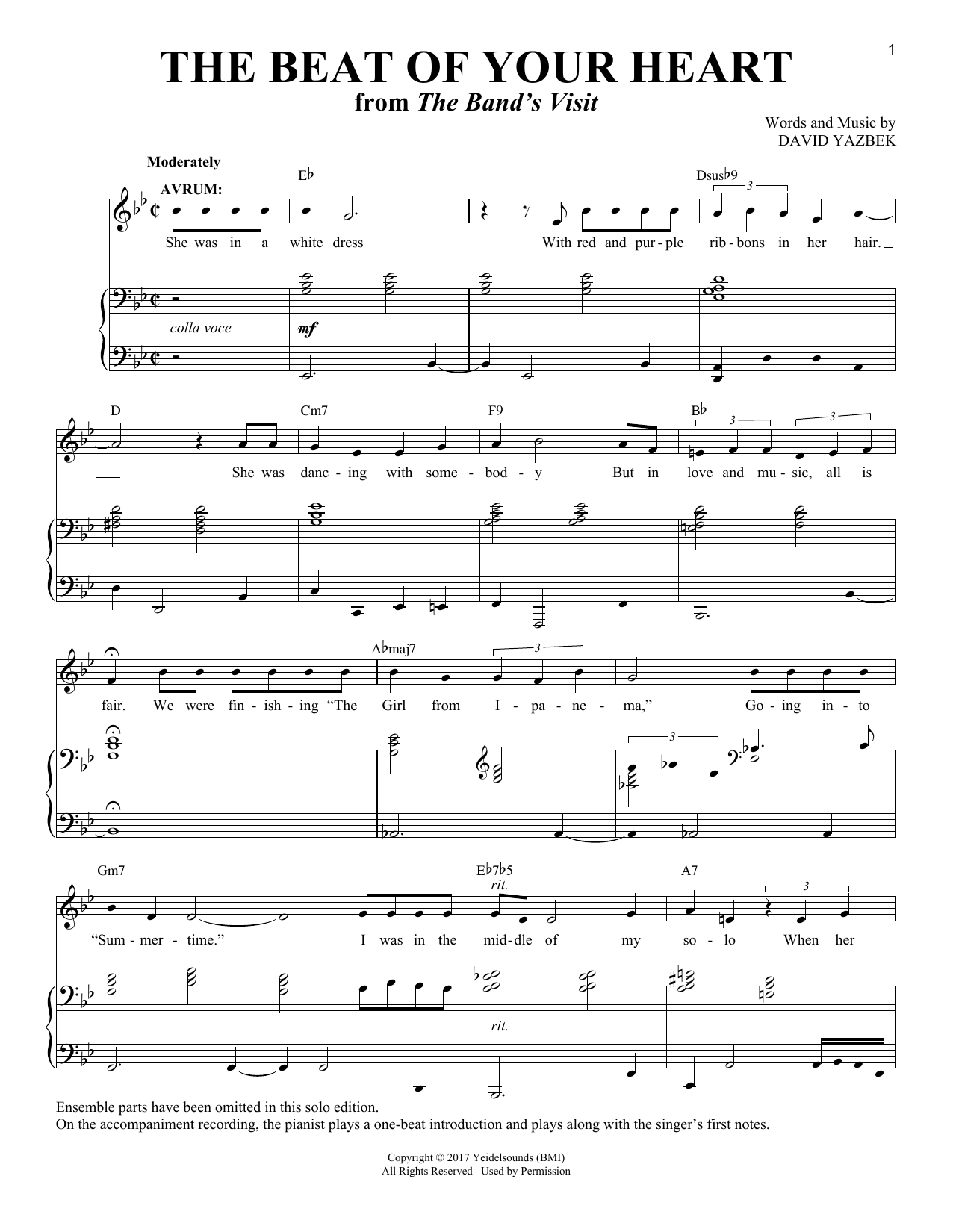 Download or print David Yazbek The Beat Of Your Heart [Solo version] (from The Band's Visit) sheet music, chords and digital score arranged for Piano & Vocal. This Musical/Show score includes 8 page(s).