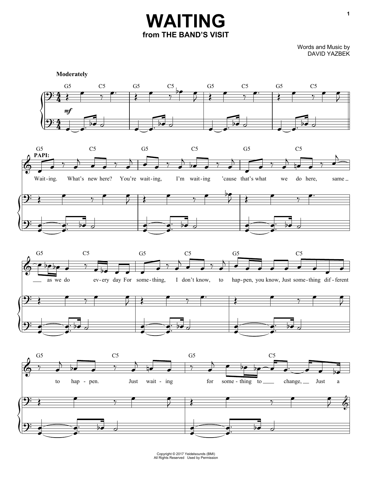 Download or print David Yazbek Waiting sheet music, chords and digital score arranged for Piano & Vocal. This Musical/Show score includes 7 page(s).